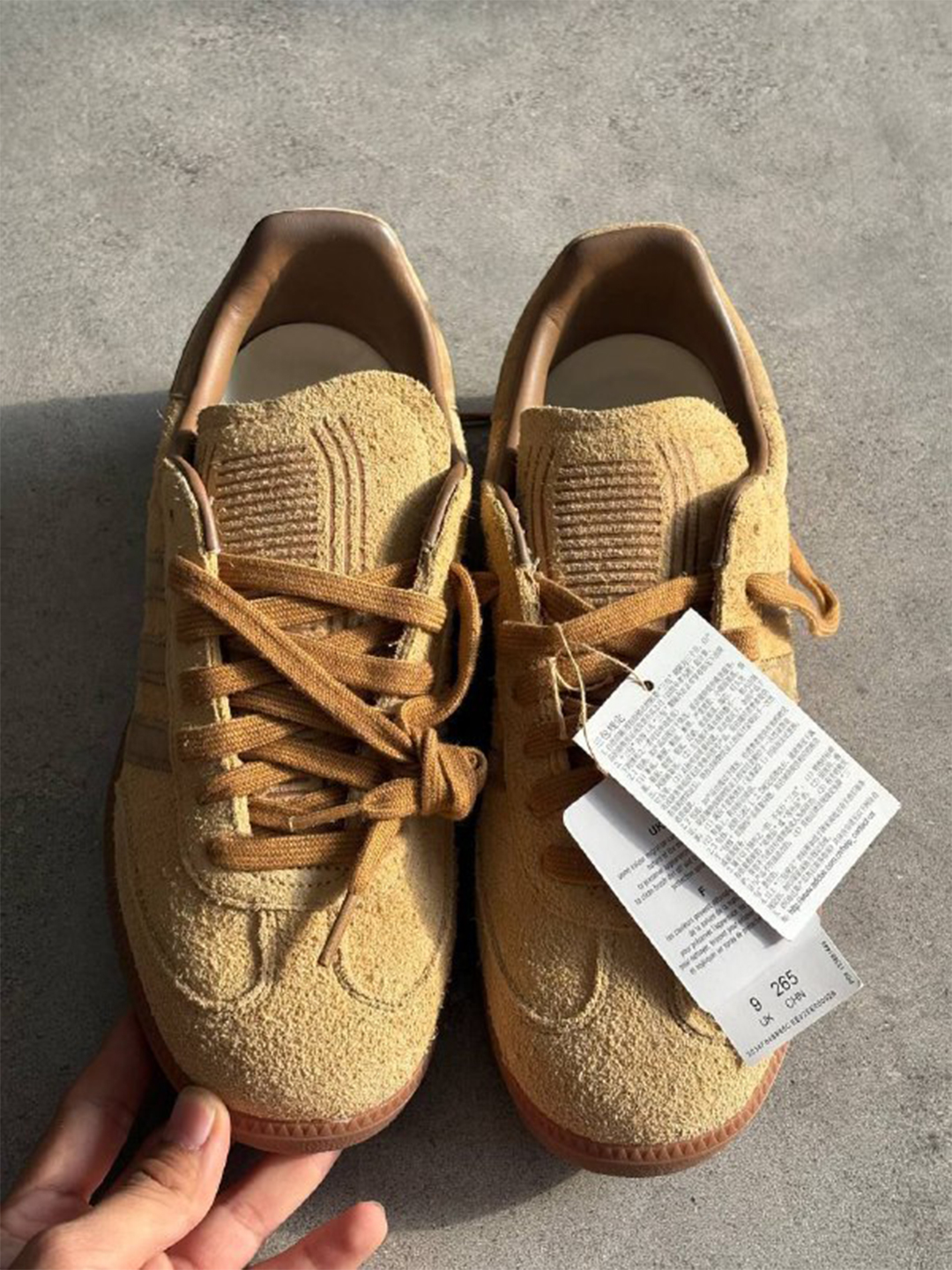 • لوگوی “JJJJound” به رنگ طلایی روی قسمت بیرونی کفش (نزدیک به ۳ خط معروف آدیداس).